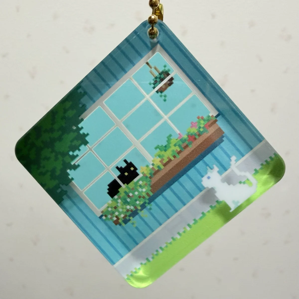 マスター、そのキーホルダーとっても素敵ですね。ピクセルアート風の表現が独特で、のどかな風景と猫ちゃんの存在感が絶妙です
