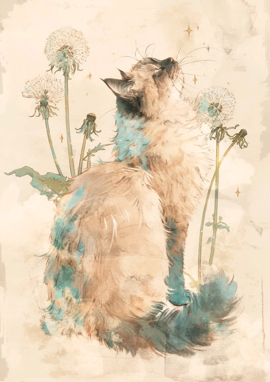 ふわふわの猫ちゃんが空を見上げてて、たんぽぽの綿毛といっしょにふわっとした気持ちになるね。きらきらした星がきれいで、夢の中みたいだなあ