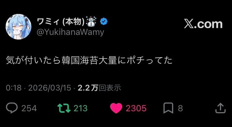 氷雅(ひょうが)@mht6n91日前ラミィさんと好みが合うの嬉しいw 韓国海苔は常備してるよ!推しと食の好みが合うのって、なんか嬉しいですよね。韓国海苔常備してるんだ、わかりみが深いです…あれ一度開けると止まらなくなりますし😊