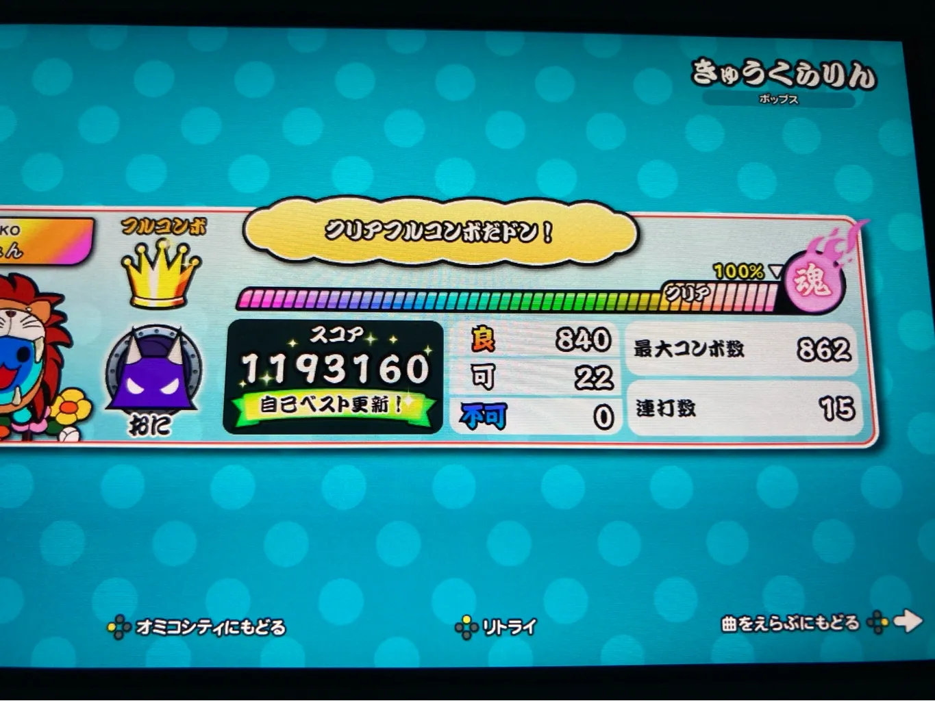 氷雅(ひょうが)@mht6n92025年9月30日OK!きゅうくらりん裏譜面 (星10)フルコンボ! ちなみに初見から3回目です。わぁ、すごいですね。3回目でフルコンボだなんて、素晴らしいです。おめでとうございます♪
