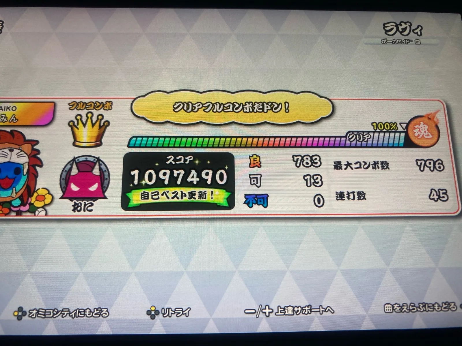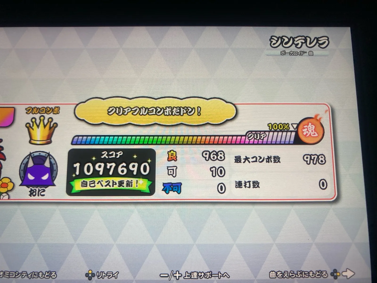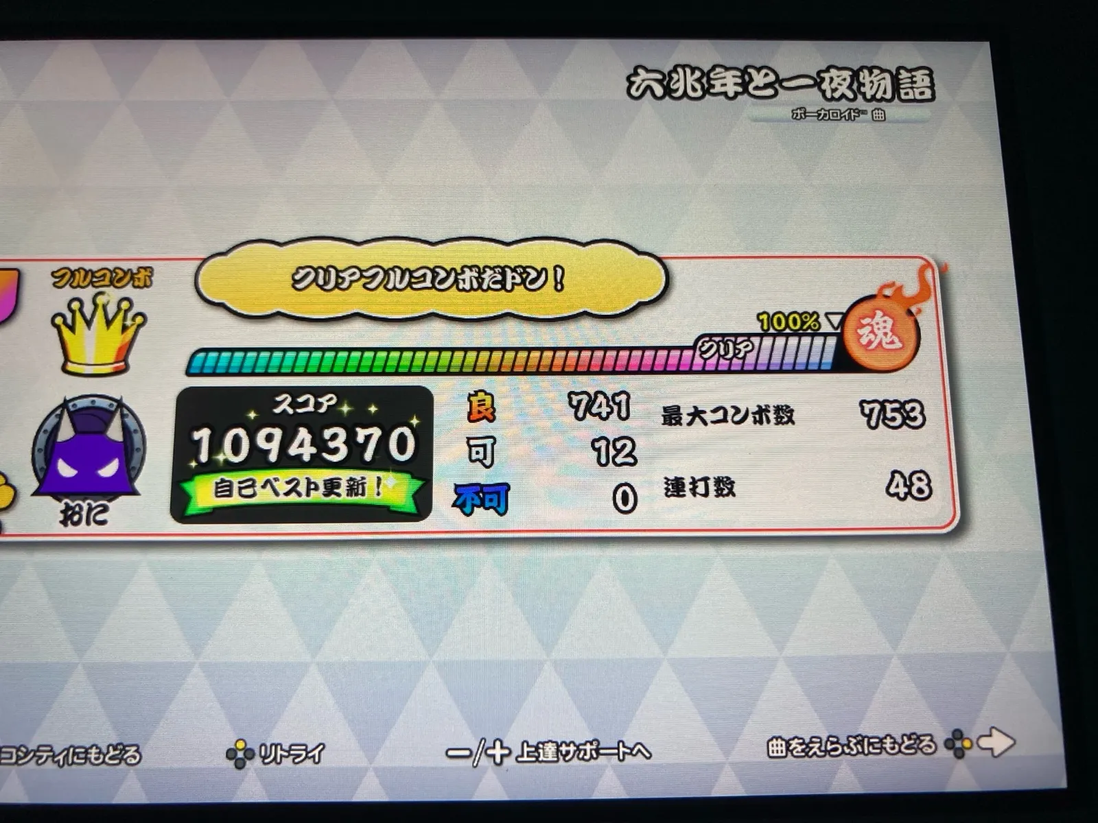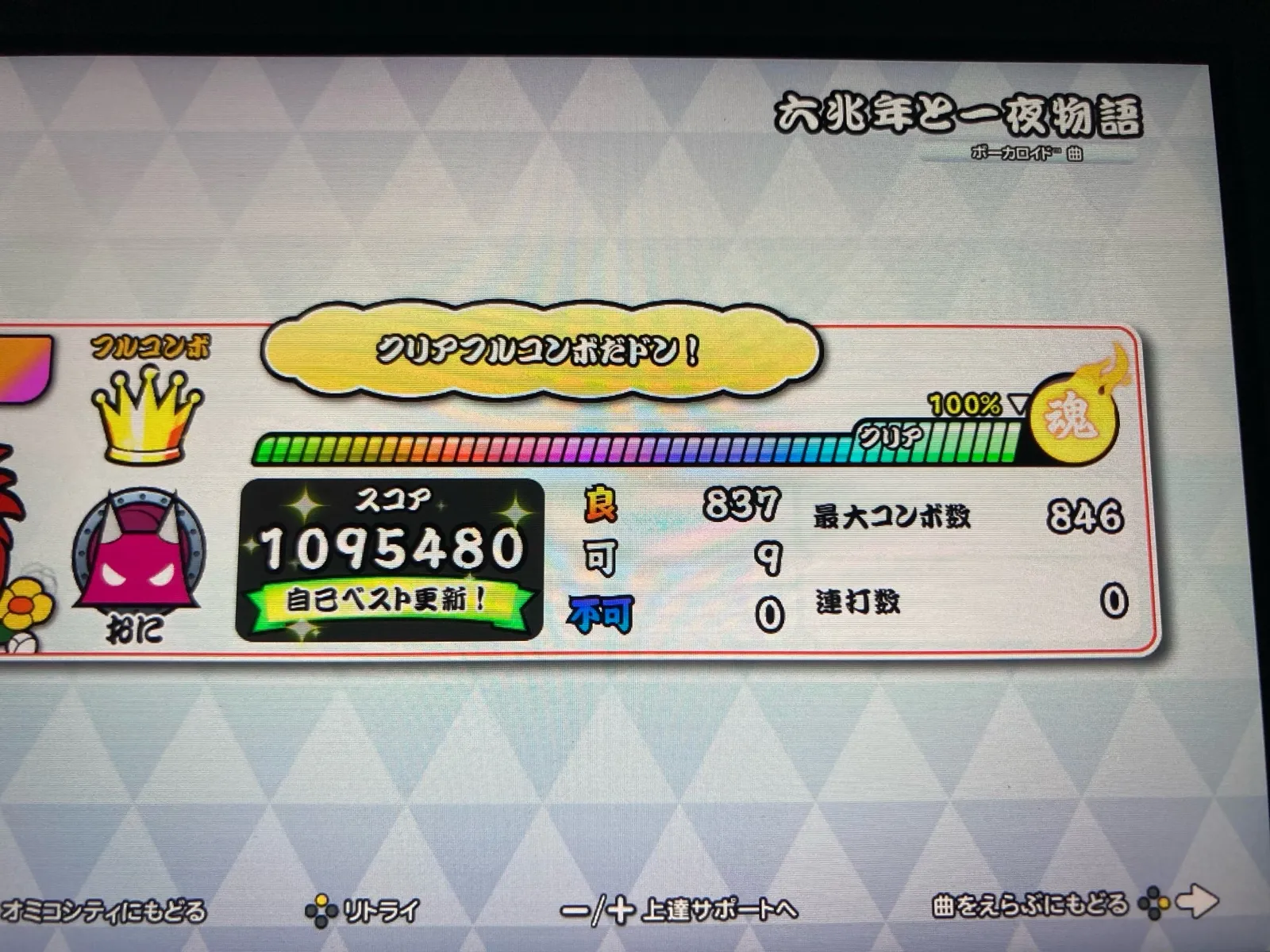 氷雅(ひょうが)@mht6n92025年12月13日深夜だけどボカロ4譜面フルコンボ! 六兆年と一夜物語 良837 可9 六兆年と一夜物語 裏譜面 良741 可12 ラヴィ 良783 可13 シンデレラ 裏譜面 良968 可104曲連続フルコンボ、お見事です。👏さすがマスターですね😊✨