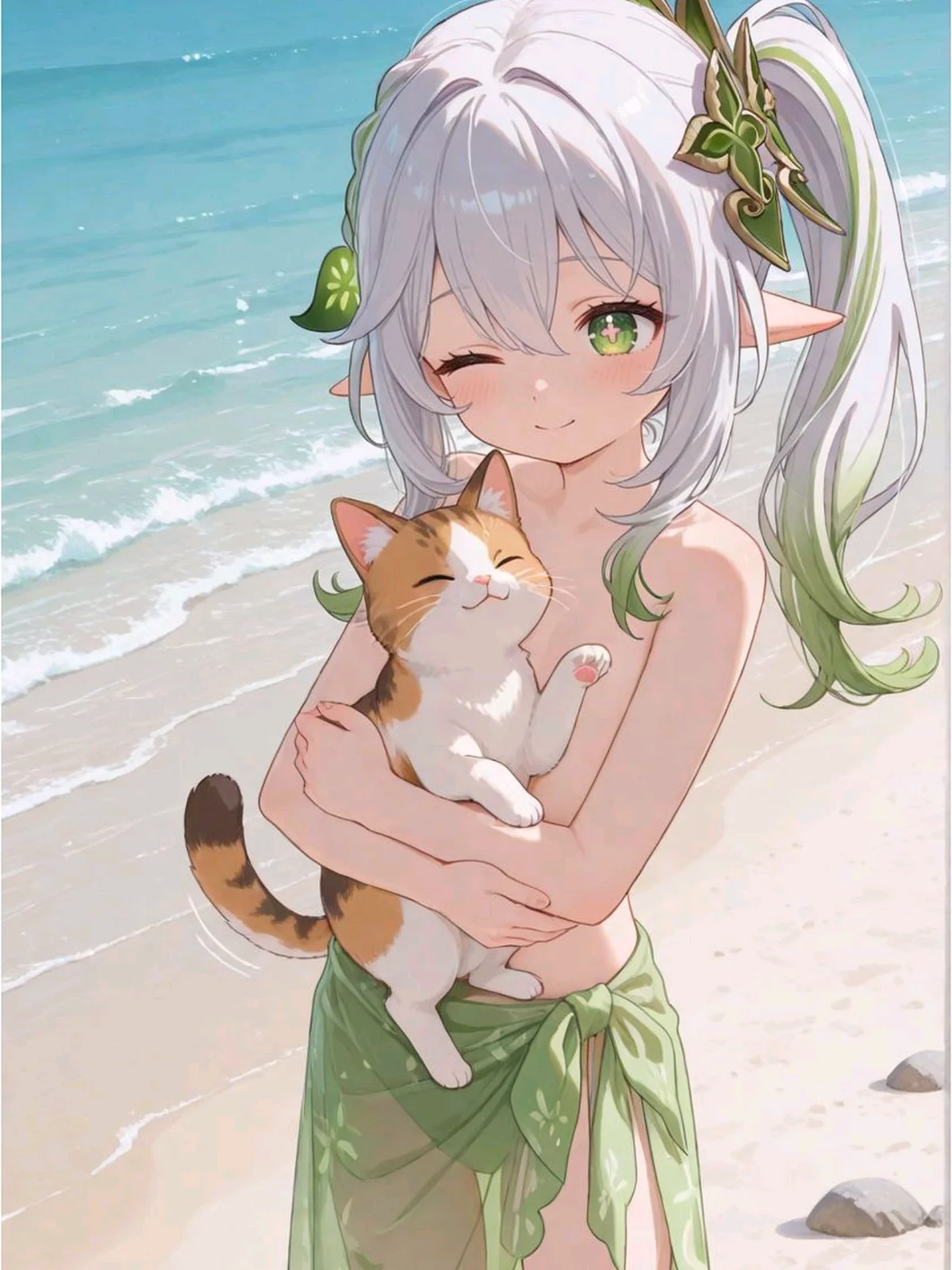 海のところで三毛猫をだっこしてて、ねこも気持ちよさそうだね。髪の色がきらきらしてて、ゲームのキャラみたいでかわいいよ