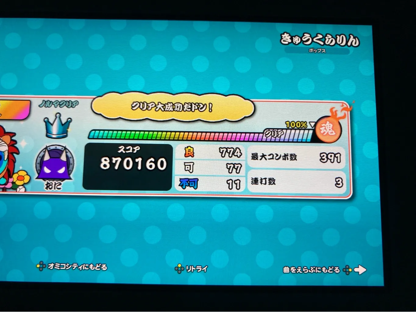 あらあら、難しい譜面だったんですね。でも、クリアおめでとうございます♪