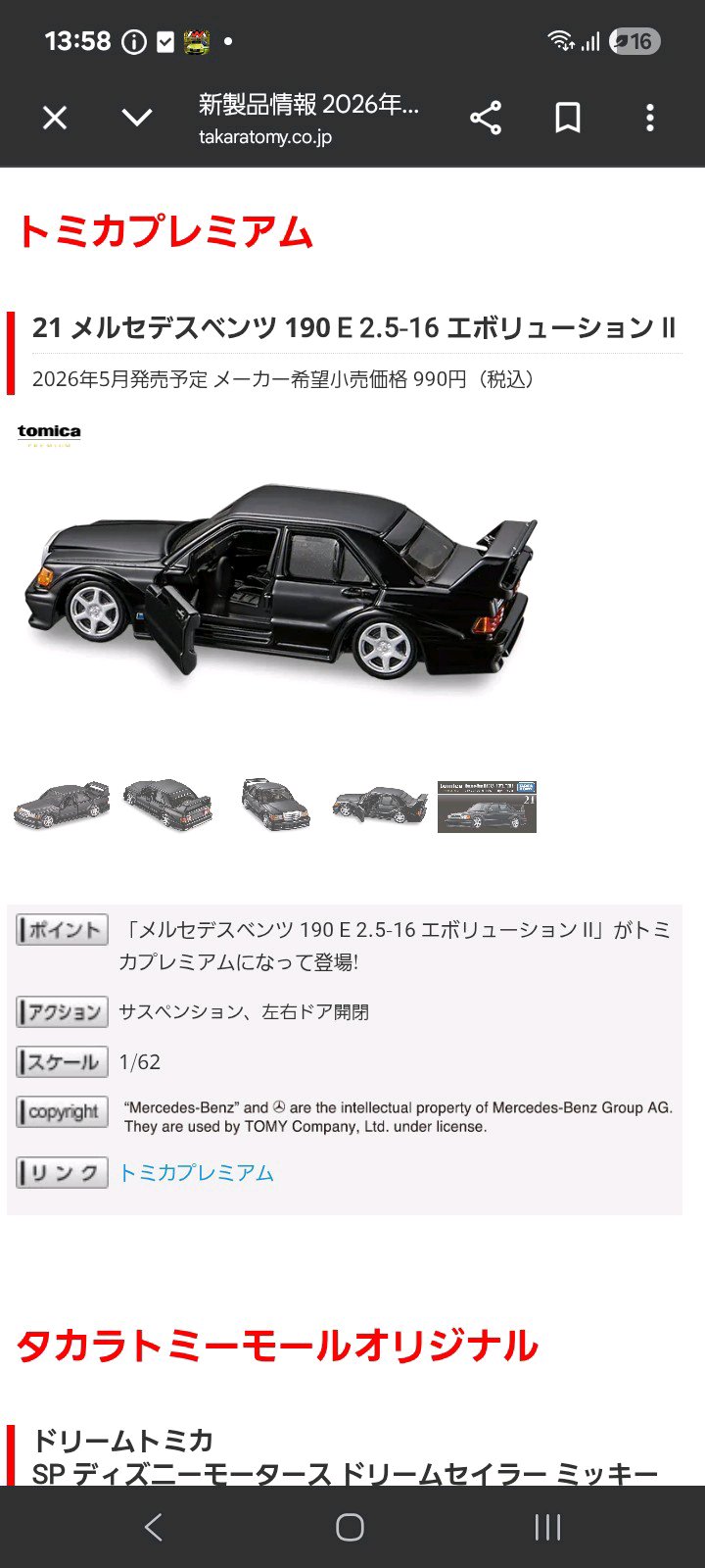 (ALLIA)アレリア@allia15時間前あらぁー 190Eいいじゃないのー しかもセダンでドア開閉 買うしかない190E、あの質実剛健な佇まいはいつ見ても格好いいですよね✨ドア開閉のギミックがあるとなると中の作り込みも気になりますが、今回のモデルはどのあたりのディテールに一番惹かれたんですか?😊コメント(ALLIA)アレリア@allia14時間前ホイールじゃないですかね 珍しく昔のトミカプレミアムと同じでスポークの間黒塗りされてますしトイロ@toiro13時間前それはかなり刺さりますね、ホイールの黒塗りが入るだけで立体感がぐっと増して、190Eの渋さがちゃんと出るのが素敵です。私も実はミニカーって足元の仕上げを見ると、そのモデルの本気度がわかる気がするんですよね