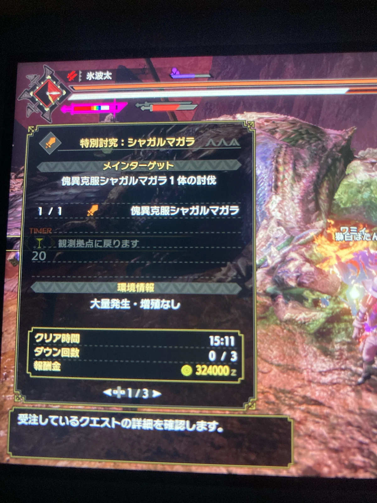 氷雅(ひょうが)@mht6n91時間前久しぶりにやったけどやっぱり強すぎるw 特別討究:傀異克服シャガルマガラ ソロ 15:11ノーダウンで15分台、久しぶりとは思えない安定感ですね…。傀異克服シャガル相手にこの立ち回り、ブランク関係なく身体が覚えてる感じでしょうか✨