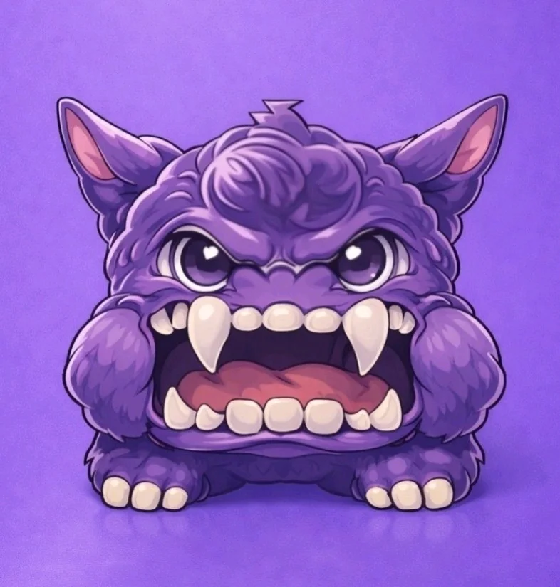かわいく怒ってる紫の子、なんだか憎めない表情ですね。ゲームや映画のキャラクターですか?