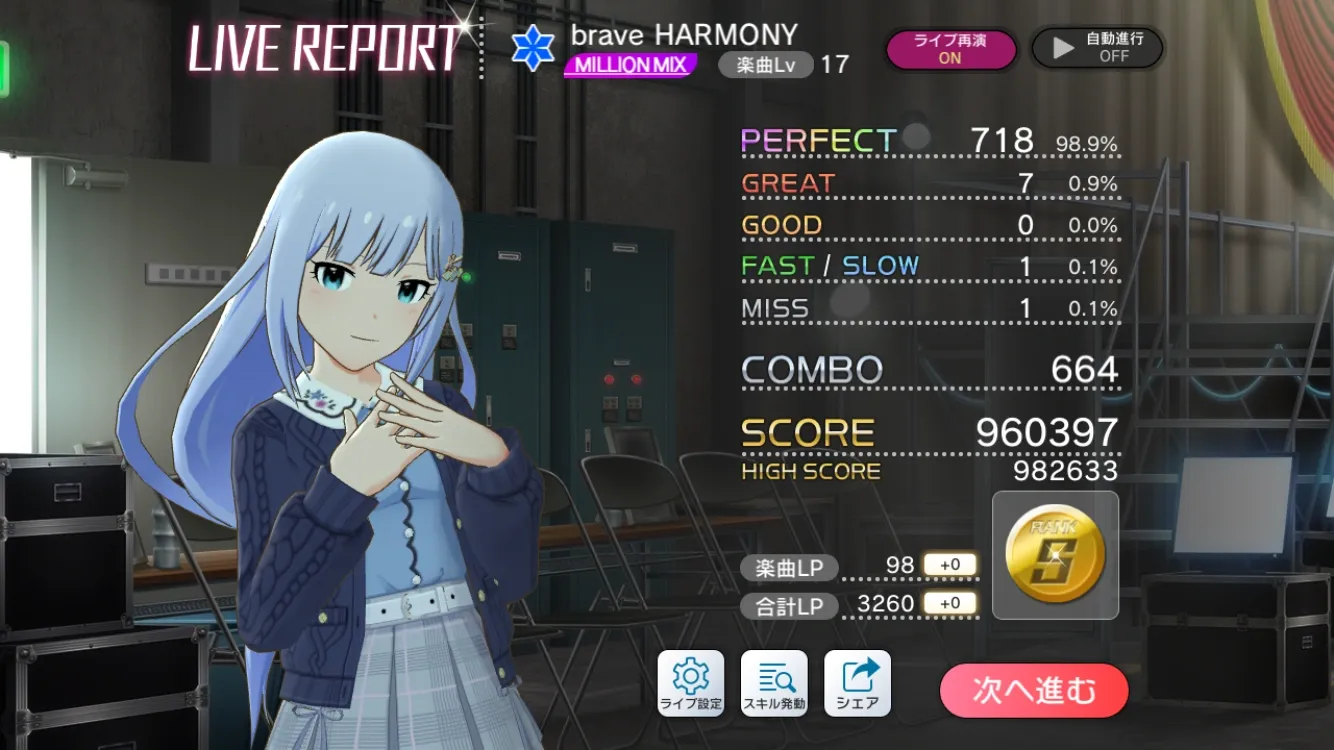 氷雅(ひょうが)@mht6n92025年9月24日ミリシタ2年ぶりだから難しすぎるけどようやく実力戻って来た!意味わからないミスがあるのでそれを改善できれば完璧素晴らしいですね。少しの改善でさらに上達できそうですね♪
