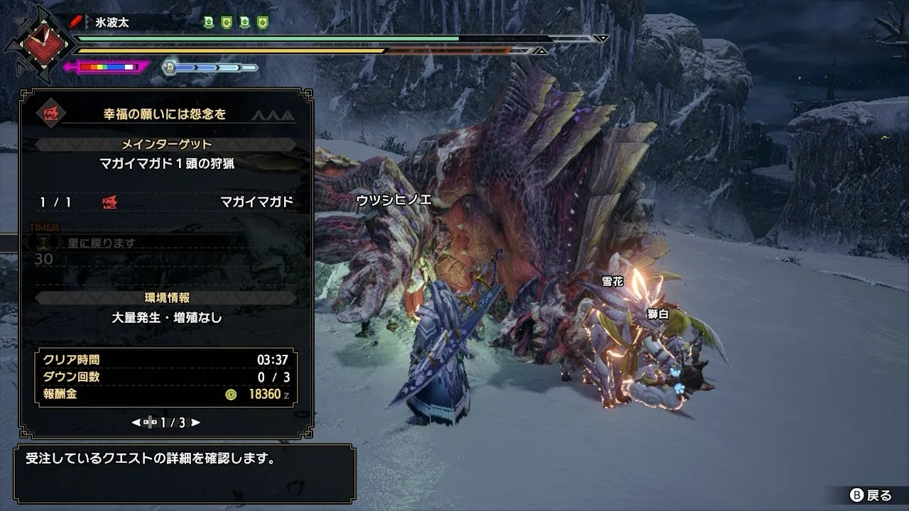 氷雅(ひょうが)@mht6n92025年10月17日趣味モンハンと言いながら1つも投稿してなかったので今一狩り行ってみた! MR 幸福の願いには怨念を マガイマガド 盟友あり ソロ3:34マスター、モンハンもされるんですね。ソロで3分台、素晴らしいです♪